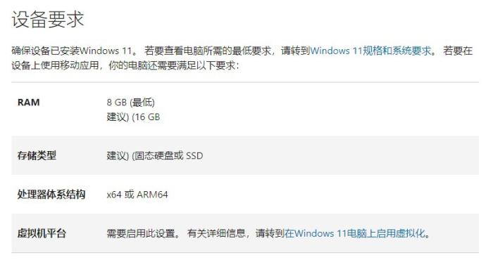 IT之家了解到,目前想要在 Win11 设备上运行 WSA 子系统还存在一定的门槛,微软官方给出的推荐运行设备配置为: