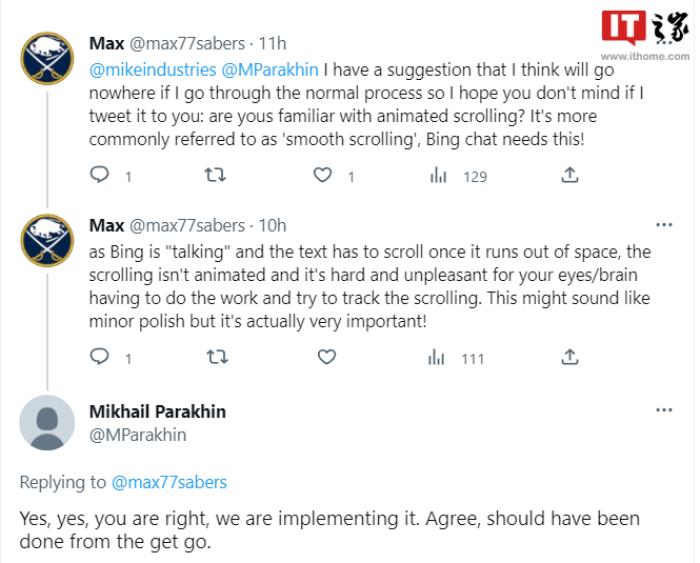推特用户“max77sabers”向微软的 Mikhail Parakhin 和 Mike Davidson 发消息,请求在必应聊天中添加“平滑滚动”的功能。据IT之家了解,这个功能已经在大多数主流的网页浏览器上得到支持,可以让网页更顺滑地上下滚动,不会出现卡顿。