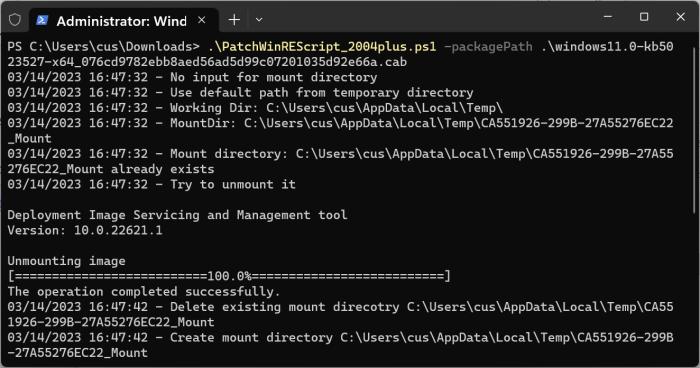 其中一个脚本名称为“PatchWinREScript_2004plus.ps1”,可以在 Win10 2004 及更高版本(包括 Win11 系统)上部署安全更新。