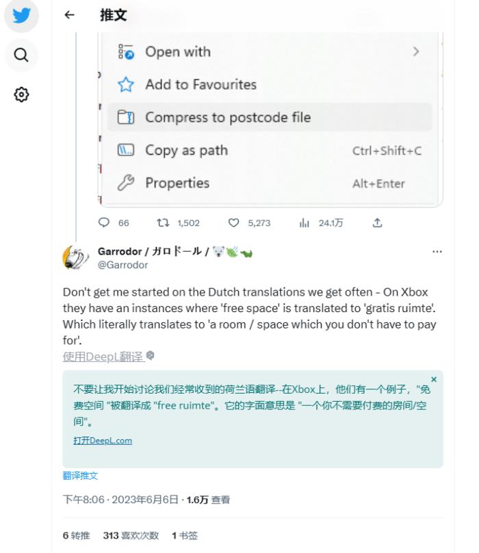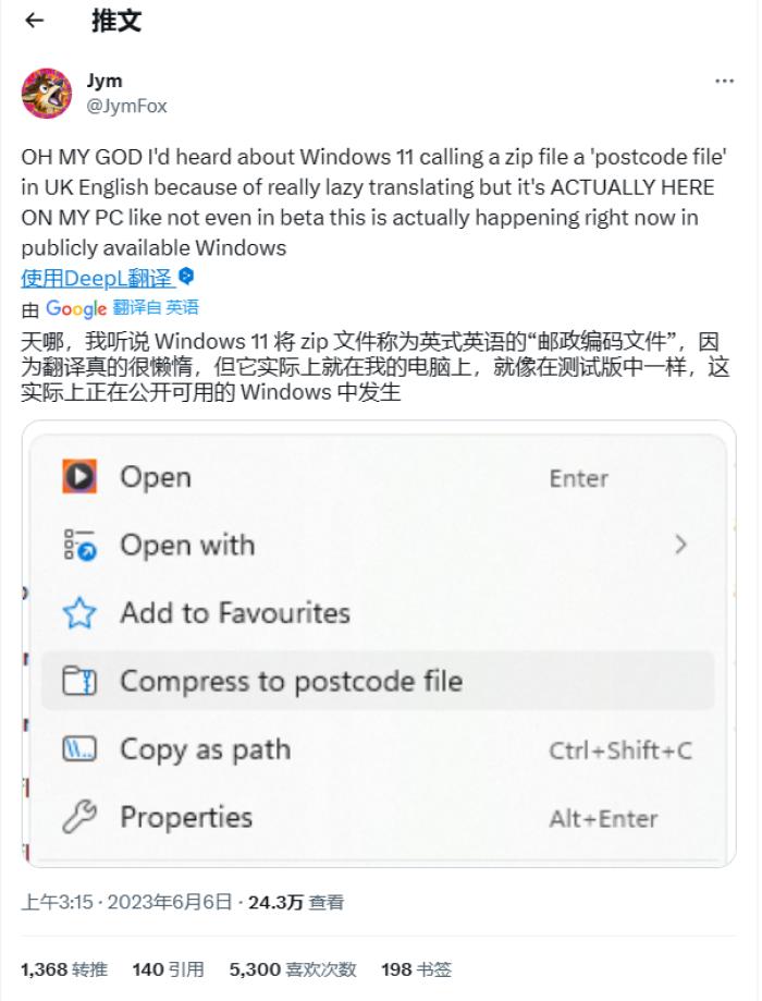 近日推特上有一名网友吐槽,当把 Windows 11 的系统语言设定为英式英语时,文件压缩为 zip 格式的提示出现了翻译错误:“Compress to postcode file”(IT之家注:正常情况下应为 Compress to zip file)。