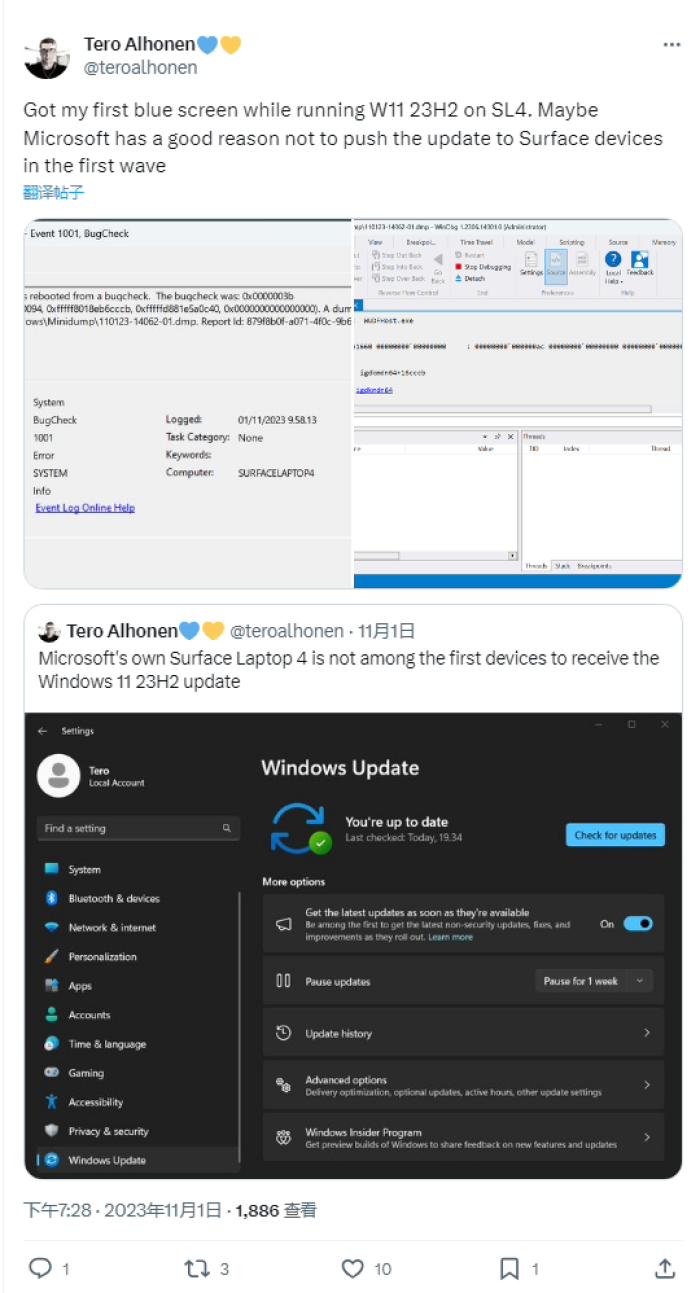 Tero Alhonen 通过 Windows Update 方式,将 Surface Laptop 4 更新到 Win11 23H2,发现出现蓝屏问题。