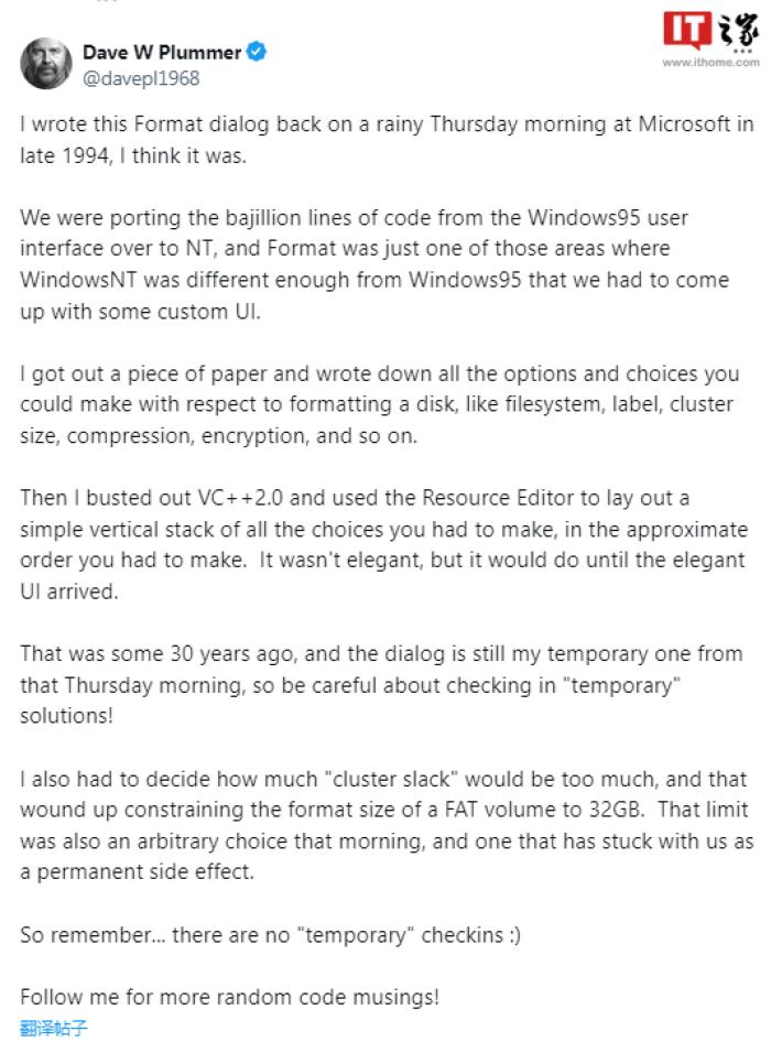 此外IT之家注意到,Dave 当初还凭直觉决定了 cluster slack 大小的限制,这直接导致了 FAT 卷的格式化最大容量为 32GB。同样,这也是一个当初的临时决定,却意外地变成了至今仍在使用的永久限制。
